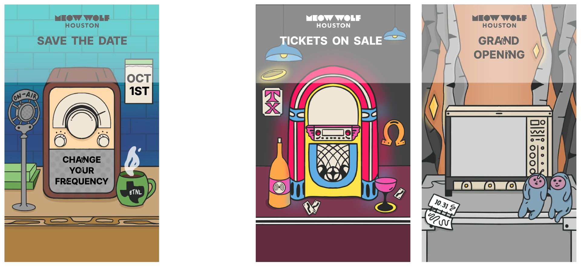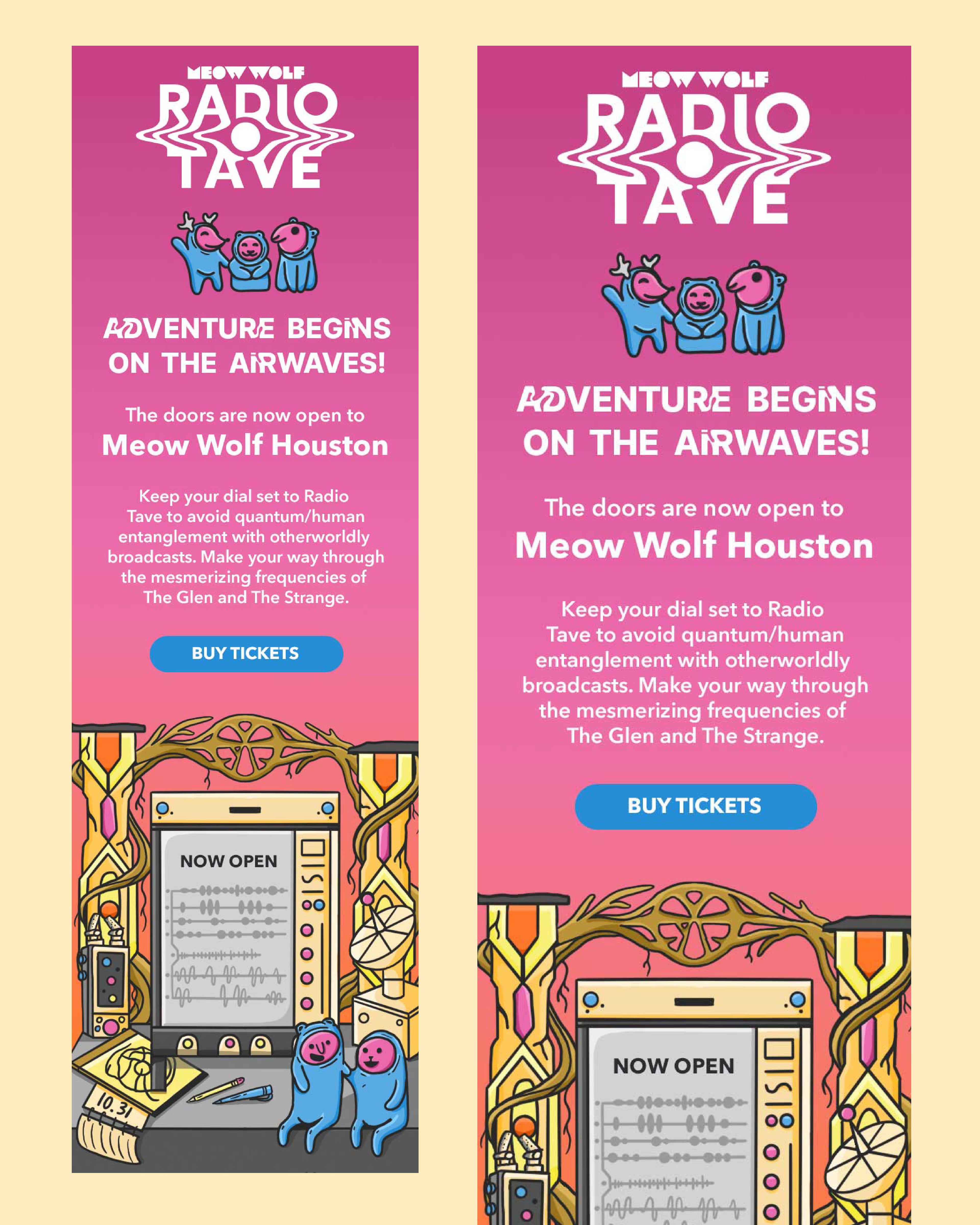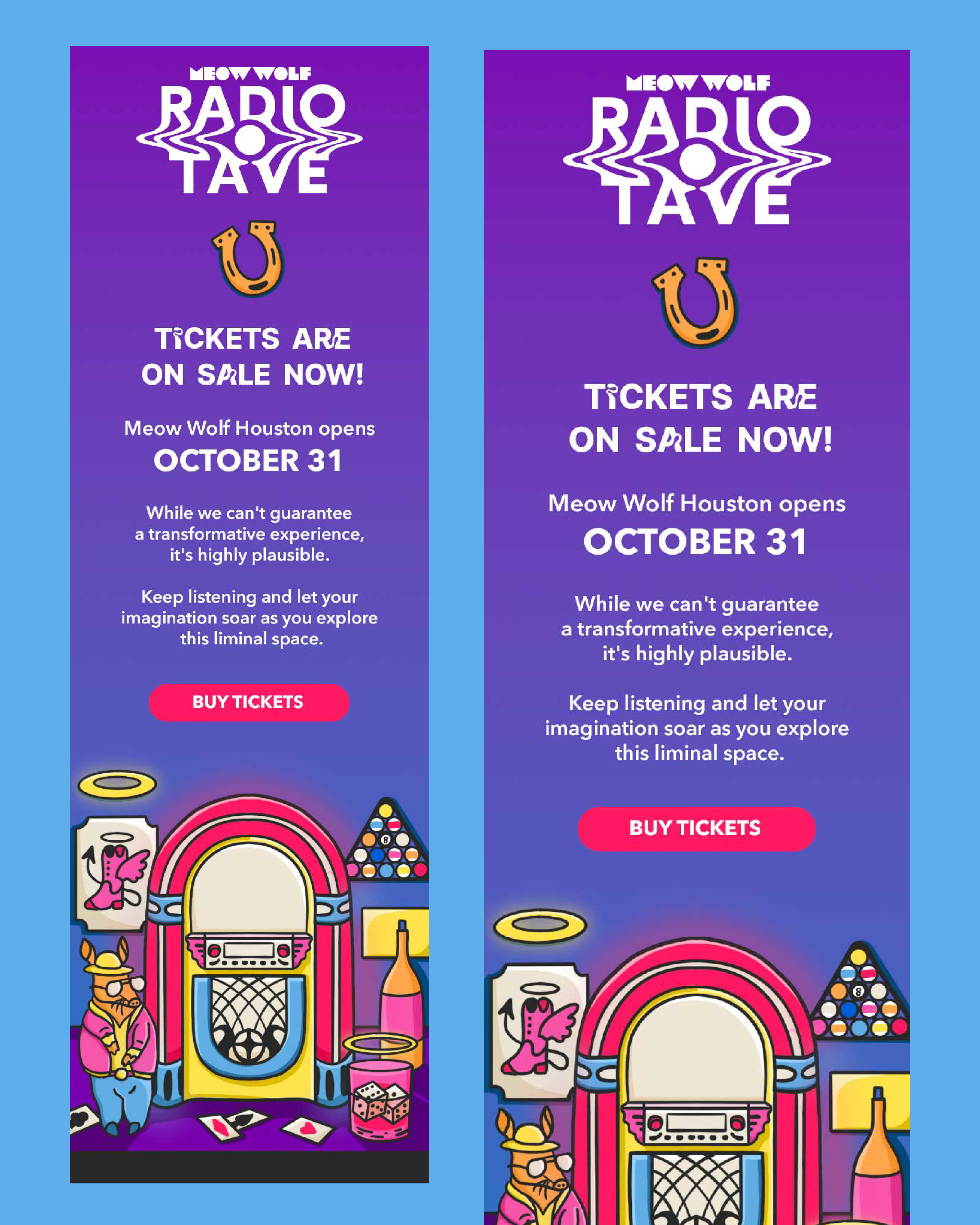 Each of these illustrations dives into a different anchor space of the Meow Wolf Houston Exhibit (The Radio Station, Cowboix Hevvven, and The Ruins). I created the emails themselves in photoshop and broke apart assets to send to our digital team to plug into our email program. These emails were sent out to over 650k people.