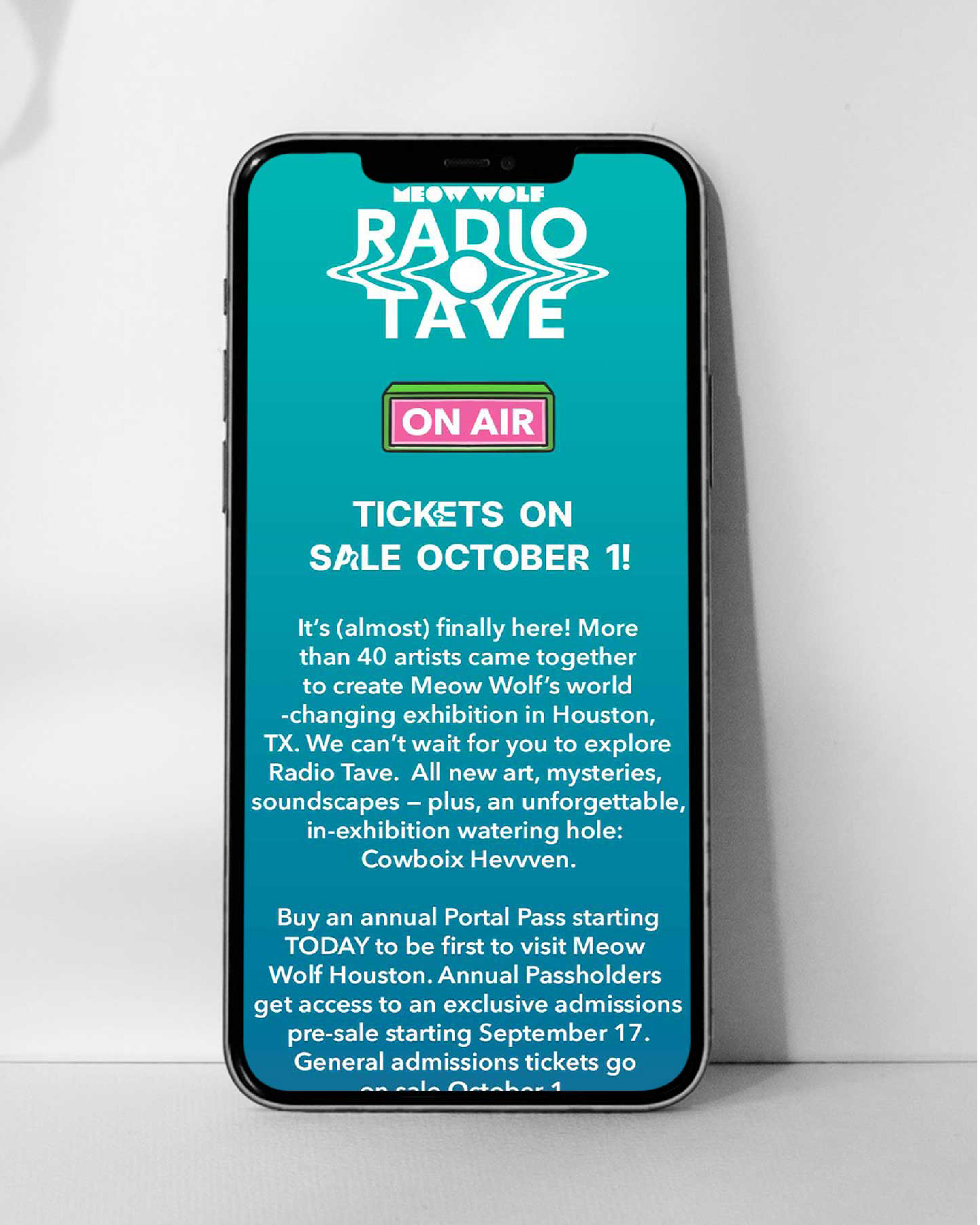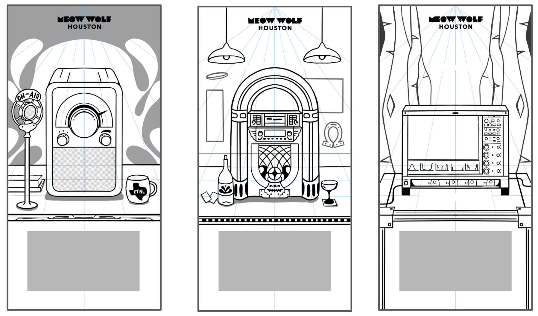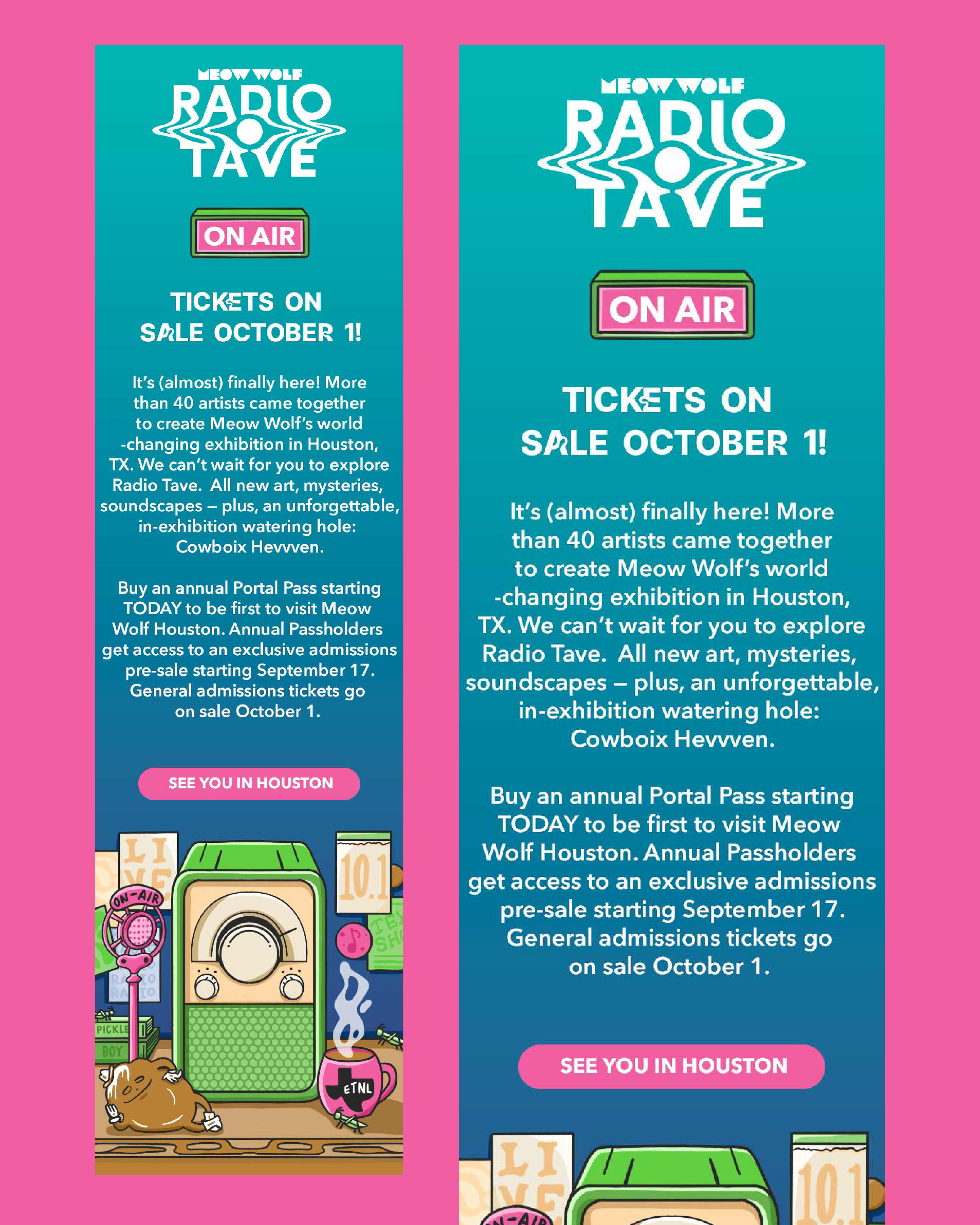 Each of these illustrations dives into a different anchor space of the Meow Wolf Houston Exhibit (The Radio Station, Cowboix Hevvven, and The Ruins). I created the emails themselves in photoshop and broke apart assets to send to our digital team to plug into our email program. These emails were sent out to over 650k people.